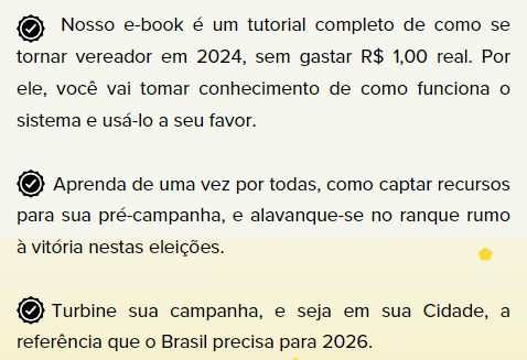 Nosso e-book é um tutorial completo de como se tornar vereador em 2024, sem gastar R$ 1,00 real. Por ele, você vai tomar conhecimento de como funciona o sistema e usá-lo a seu favor.